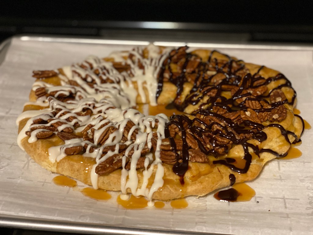 We had chocolate and caramel sauce in the fridge so I just used that instead of making my own but it looked quite stunning! It didn’t quite taste like the fruit Kringle’s I’ve had in the past, but it has a nice pastry texture and was close enough! Especially considering it didn’t take nearly the time an actual Kringle takes!