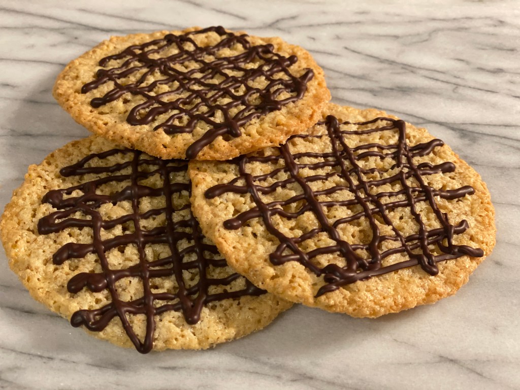 There are a couple of different ways you can use chocolate with these cookies. The directions say to put the chocolate on the bottom of one cookie and then add another so it creates a little cookie sandwich. Because my cookies were so much bigger and I wanted enough to share with my colleagues I opted to not create the cookie sandwiches and just put the chocolate in a piping bag and did a little design on the top of each cookie.