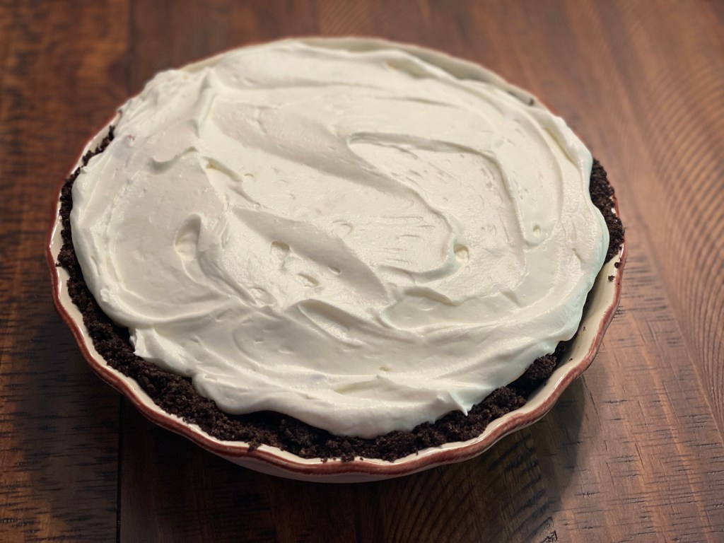 Recently my grandfather and I were talking about pie, which isn’t really abnormal; but, he was telling me that he grew up eating Chocolate Icebox Pie. Having never heard of this pie before I wondered how it was different from Chocolate Meringue Pie, Chocolate Cream Pie, Chocolate Chess Pie or Chocolate Silk Pie. I’m still a little confused as to how all of these pie’s are different but based on my limited research this was the only one that wasn’t cooked in some way. I digress… I’ve been wanting to make a Chocolate Icebox Pie for my grandfather since he hadn’t had one in a long time so I raw across a few recipes and chose this one because it had an Oreo crust!