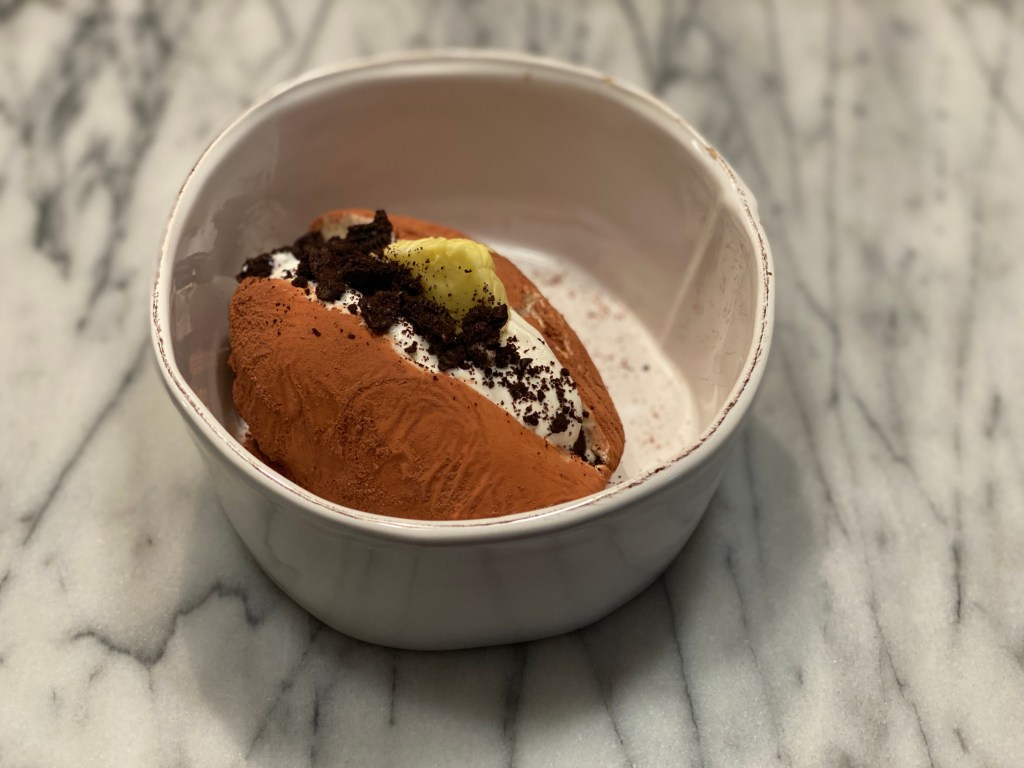 Your final step is to put everything together! Grab the ice cream out of the freezer and take all of the plastic wrap off. Roll the ice cream into the Nesquick mixture and then cut it in half so it looks like a cut baked potato. Because I want hot fudge I put it on next and then cover it with whipped cream. I topped mine with crushed Oreo’s (my version of bacon bits), but you could also use walnuts or something similar. Then cut the square of butter so it looks like a pat of butter and gently push it into the whipped cream. Voila! I wouldn’t recommend making more than one at a time since the ice cream will melt but it’s a fun dessert to make and tastes delicious as well!