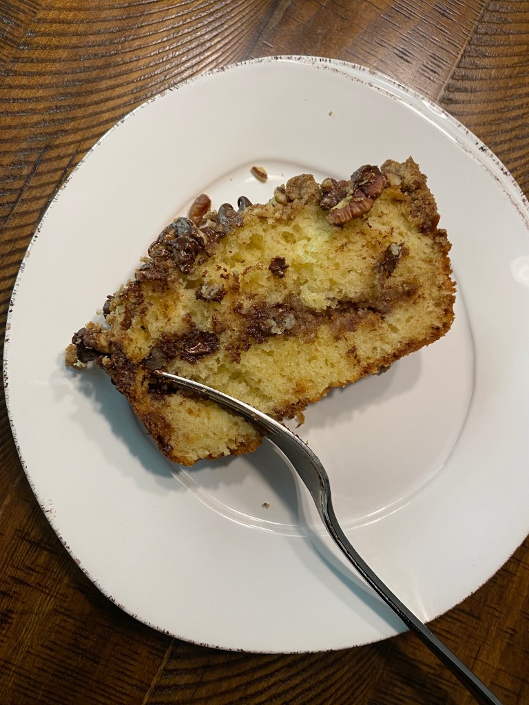 For my final coffee cake recipe for this month I decided to try this Sour Cream Chocolate Chip Coffee Cake. I don’t think I’ve made coffee cake in a loaf pan before but I’m not sure why because that seems super fun and makes it easier to serve (in my humble opinion).