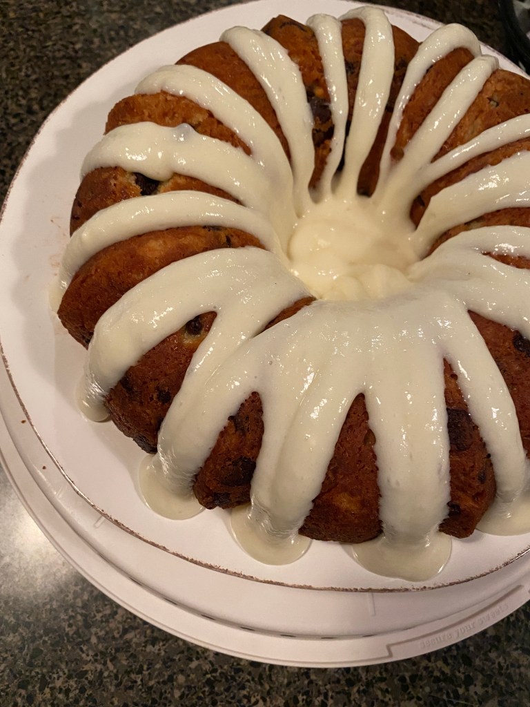 This is a pretty easy recipe to throw together and doesn’t take a ton of active baking time. The only real change I made was using sour cream, but I didn’t have enough so I used about 1/4 cup of Greek vanilla yogurt to get to the amount needed. I don’t know that I’d use that for the full amount but you totally couldn’t tell a difference in taste. I made sure to spray the pan really well since nothing is worse than missing chunks out of a bundt cake.