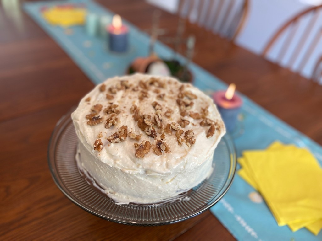 The frosting is pretty simple: 2 blocks softened cream cheese, 1 stick softened butter, powdered sugar, and vanilla extra. I was making the frosting portion at someone else’s house and since I didn’t want to dirty up a bunch of their dishes I used a hand mixer. I ended up frosting the whole cake instead of just the top portions of the cake and then reserved some of the chopped walnuts to use as decoration on top. It was a little sloppy looking and I might should have added a little more powdered sugar so it was more stable, but it didn’t last very long at the house so that wasn’t a huge issue.