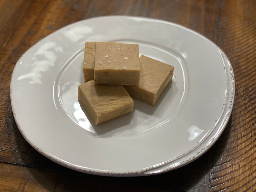 Line an 8×8 pan with parchment paper and set it aside. Melt the sweetened condensed milk, butter, and brown sugar together. Once it’s melted kick the heat up a little and let the mixture bubble and thicken. Take the mixture off the heat and add the white chocolate and salt. Pour this into the lined 8×8 pan and then top with more salt and refrigerate at least 2 hours.