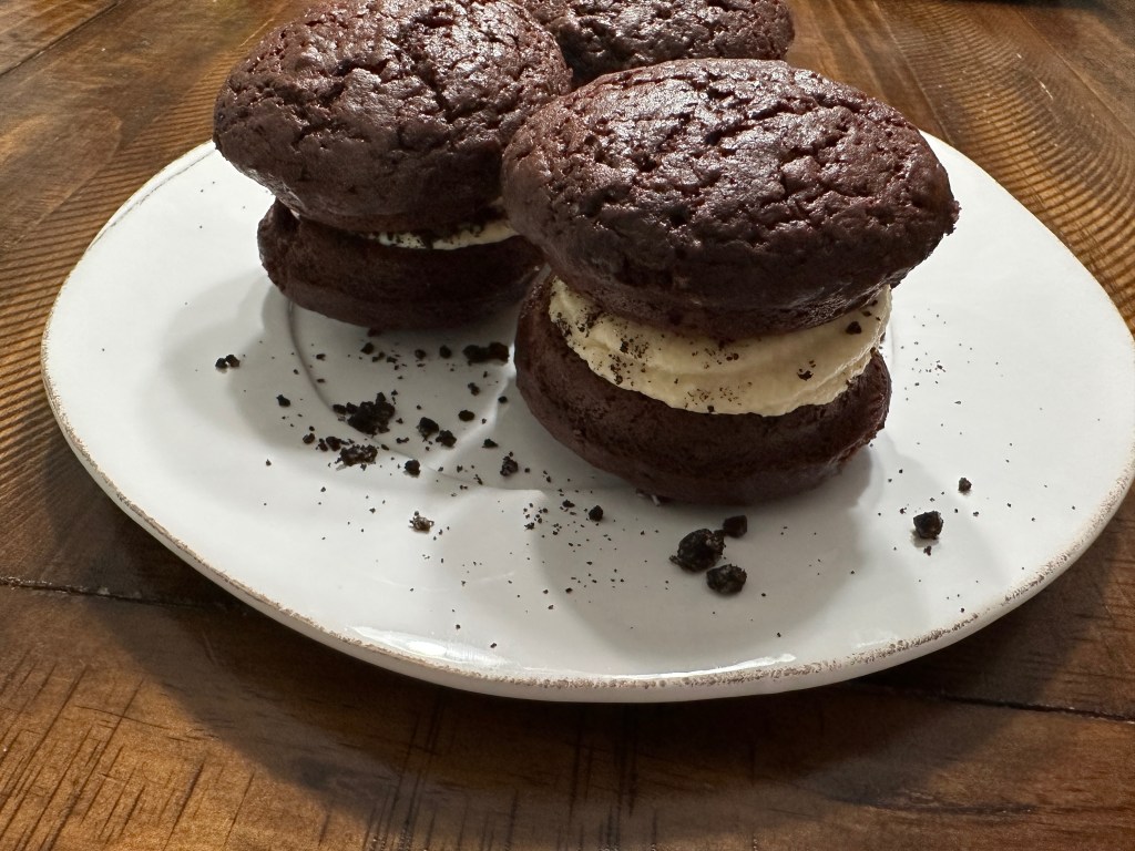 If you don’t have a whoopie pie pan (I imagine most people do not) you can use a cookie sheet with parchment paper. I picked up the wrong cookie scoop so mine ended up being huge. Since they were so much larger they did take a little longer to cook (about 7 minutes more). The buttercream was easy to make and tasted delicious by itself. Once the whoopie pies had cooled I began assembling.