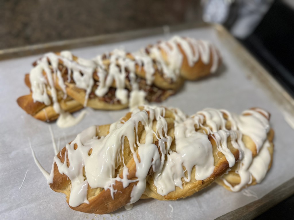 I cut the dough in half and then rolled it out as directed. I opted to do one loaf with nuts and one without and I used pecans. The braiding wasn’t very hard and I’m always thankful for the bakealong version of the recipe so I can see what they’re doing! Once this is done you let it rise another 1-2 hours. Mine went for about 1 1/2 hours and then I started preheating the oven and popped it in. I made these the night before so I mixed up the glaze the morning of and put it on so it was fresh before eating.