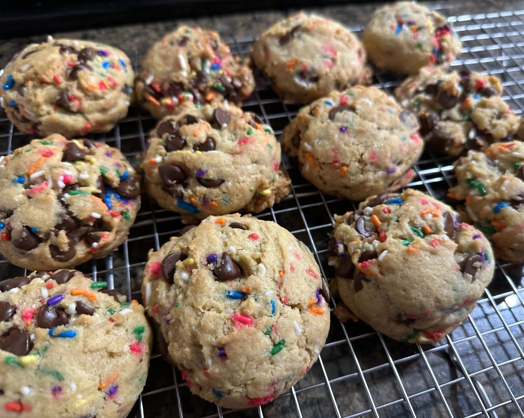 These are pretty easy, though you do want to factor in some time since these require chilling. One of the first thing you’ll notice is that this calls for melted butter. You’ll mix this with the sugars, egg, and vanilla extract. Then you’ll mix the dry ingredients into the batter, scraping down the sides as you go. Mix in the chocolate chips and sprinkles, then you’ll scoop these out onto a a cookie sheet and let them chill for at least 2 hours.