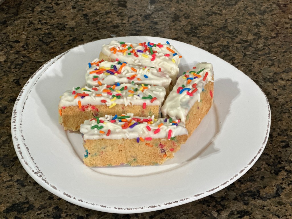 After this cools completely then you can melt the white chocolate (I used a little coconut oil to thin it out a little) and then dip the biscotti in it and add more sprinkles! Super fun looking, easy, and these tasted great!