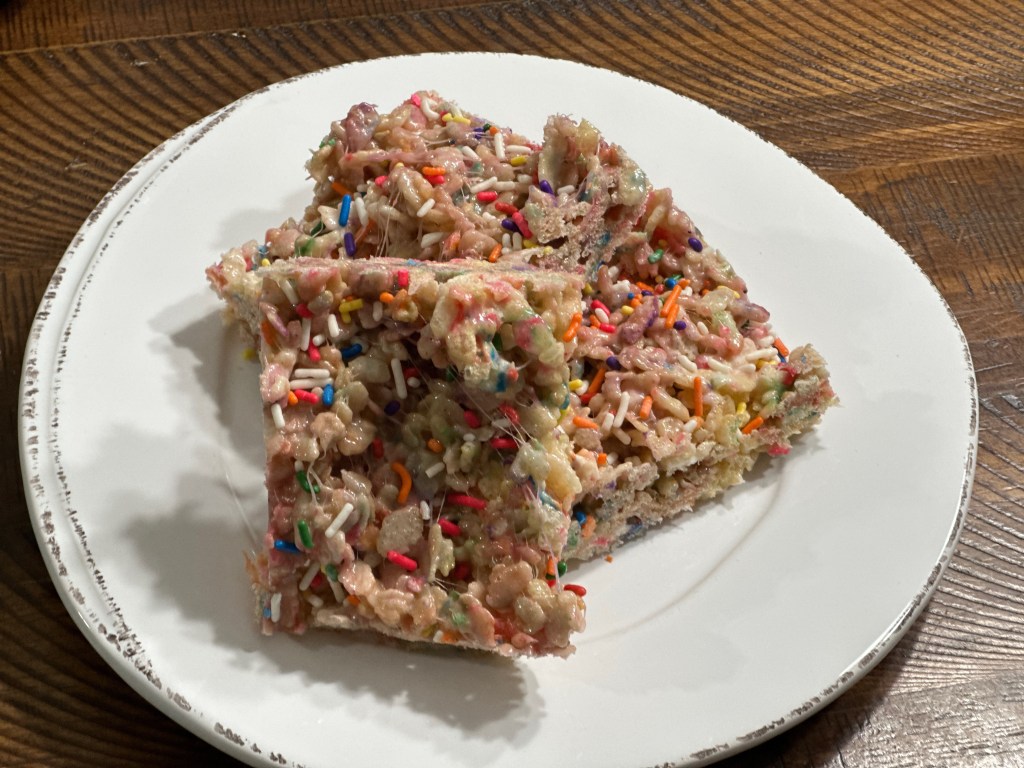 I’m sure there’s someone out there who has never made rice krispy treats, but likely not many so I won’t even bore you with comments about making these. They’re simple and as long as you don’t use too many marshmallows (see this recipe for what happens if you do….) and you don’t burn anything then you’re good. The only difference between this and regular rice krispy treats is you add 1/4 cup of sprinkles. I added mine at the very end as it recommends and they ended up melting so that was disappointing. This isn’t what you want to hear in a recipe, but mine kind of looked like a unicorn threw up on them… lol. They tasted good, but I think I’ll still to chocolate chips next time and skip the sprinkles unless I’m just putting them on top.