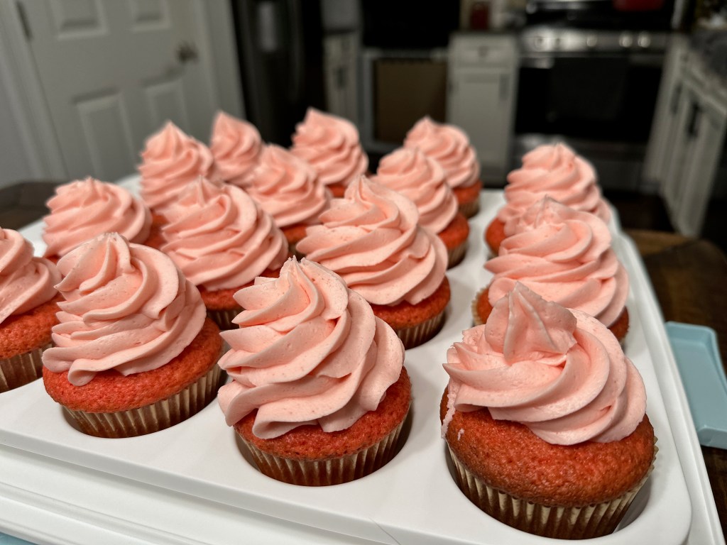The frosting was easy as well, but I didn’t make the two different colors since I was making this for something and was a little pressed for time. I just made all of mine pink and I think I threw in just a little of the cherry gelatin into the frosting while mixing as well since I had extra and figured it would help the taste.