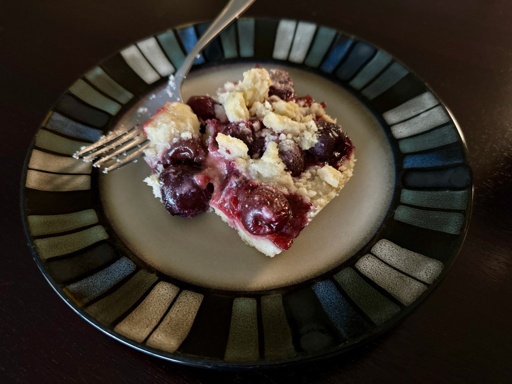 As suspected, it didn’t look pretty but it was very very good! I loved the almond crust and it paired really well with the cherry layer. It wasn’t too sweet and was a nice summery treat so well worth the effort of pitting!