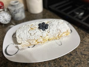 I unrolled my cake and already saw some significant cracks so that wasn’t encouraging. But I’m not a quitter (or at least not when it involves food) so I just kept going and figured even if it looked bad it would still taste good. I added a nice layer of the filling, topped with blueberries, and then attempted to roll it back up. Emphasis on the word “attempt.” It was pretty awful and I think 1/4 of the cake stuck to the tea towel. I did manage to get it back into a round shape somehow and sprinkled more powdered sugar to at least cover up the misshapen mass a little.