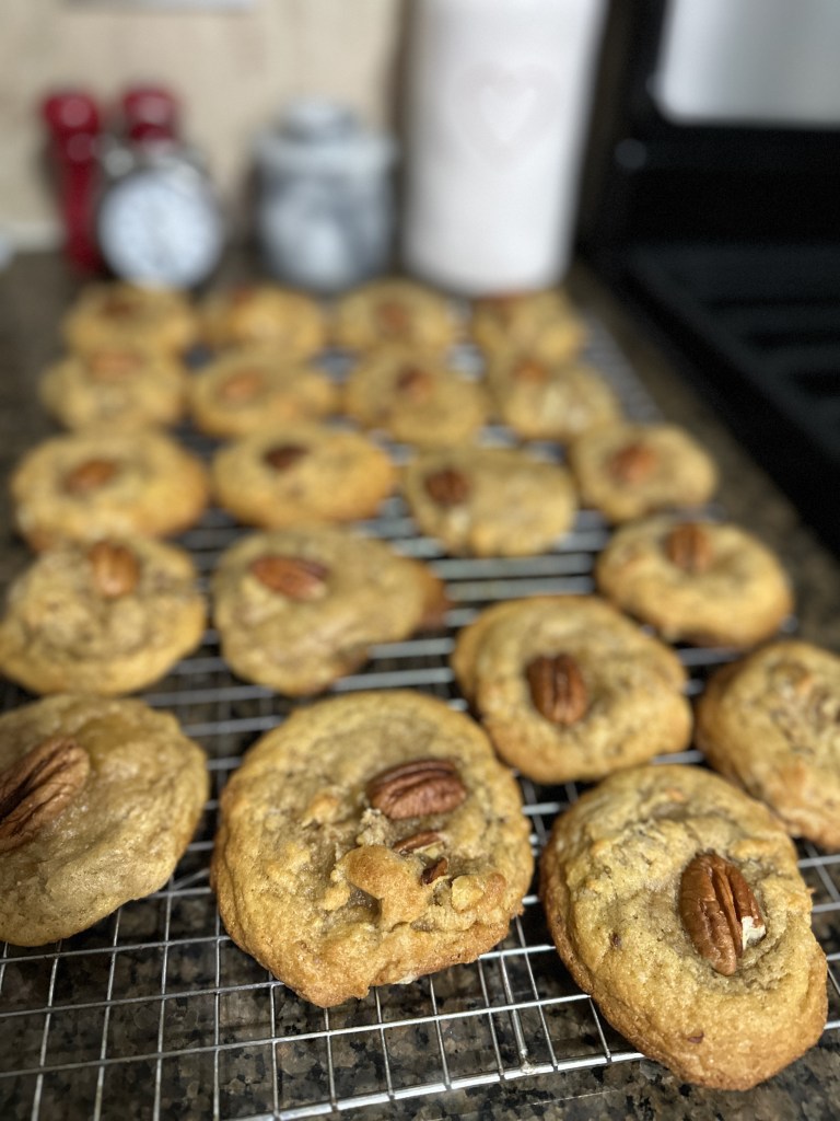 When you’re ready to make these you’ll portion them out and then add a pecan on top before baking. These smelled amazing as they came out of the oven and it said to sprinkle the cookies with granulated sugar but I forgot about that part. I couldn’t resist trying one of these while they were still warm and they were amazing; it was like eating pecan pie in cookie form! These are very similar to the Brown Butter Bourbon Pecan Chocolate Chunk Cookies I made a few weeks ago, but honestly I think I liked these better as they were simple and perfect! While they do need to chill for a bit they’re still easy and fairly quick to make.