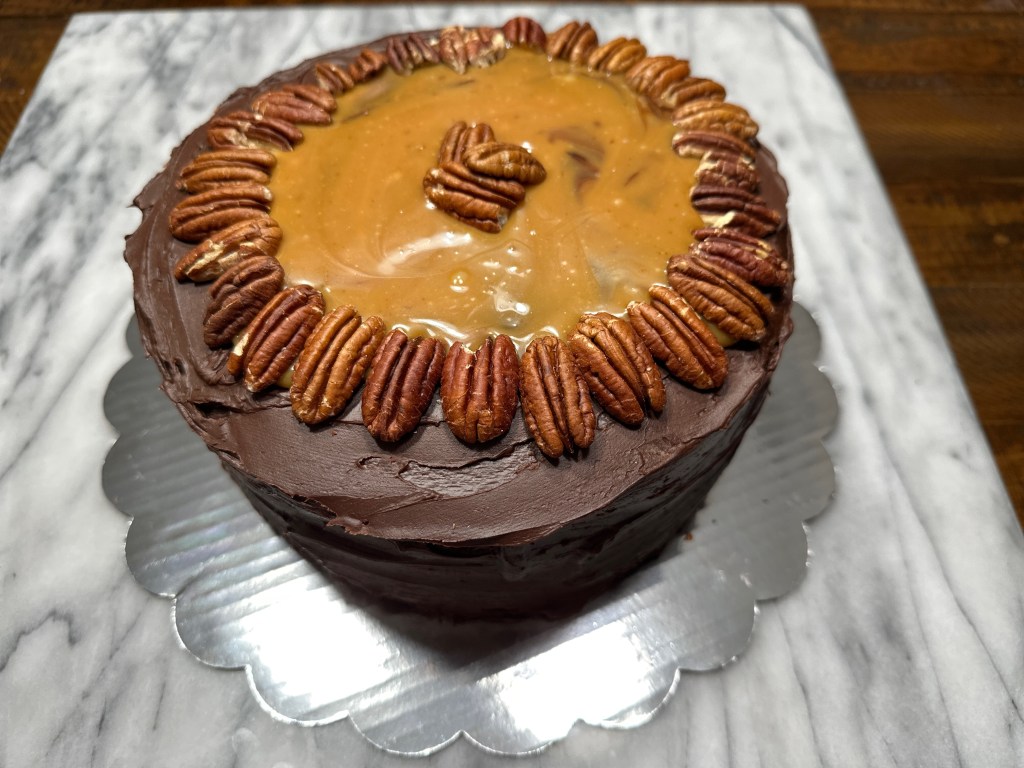 Assembling the cake wasn’t too difficult either, you’ll just put a layer of the caramel pecan filling on the first 2 chocolate layers and then ice the cake with the chocolate icing. I had to heat up the caramel a little to pour it onto the cake and it ended up melting some of the chocolate icing so I just decided to cover that section with pecans. Mine didn’t look as pretty, but it wasn’t too bad.
