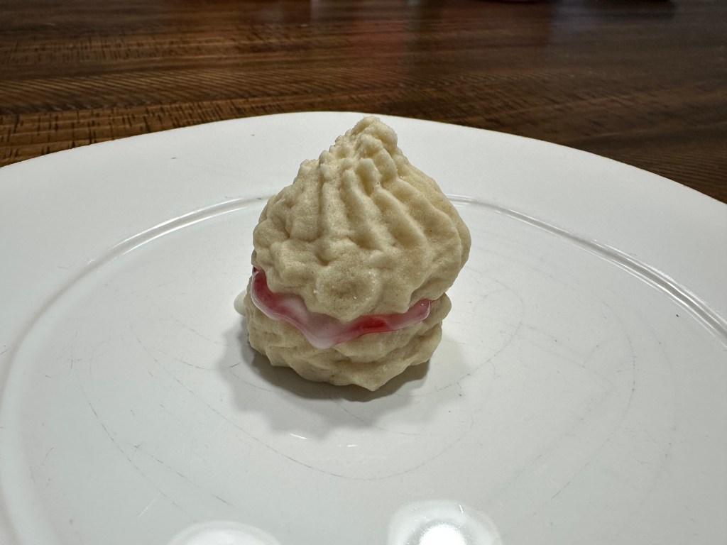 Right away, the biscuit dough gave me trouble. It came out way too thick. Like, no chance it’s going through a piping bag thick. I kept adding vanilla and a splash of water here and there, trying to loosen it up just enough to pipe the swirls. Even when I thought I had it, nothing would come out, and I had to scoop it back into the bowl, stir in more liquid, and start again. I think all that mixing definitely worked against me, because the texture ended up a bit tough, not soft and short like you want for a biscuit like this. Plus because they were so tough to pipe out they ended up with the little “hat” you see in the picture.