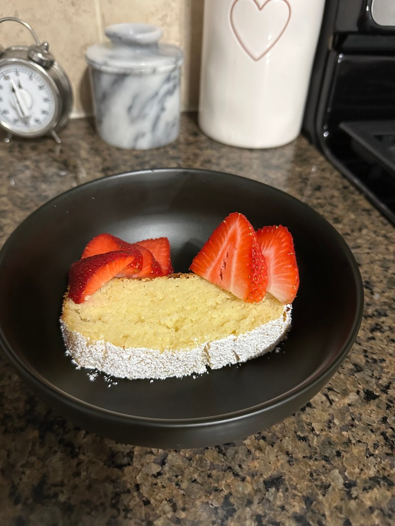 Once it was cool I dusted it with a little powdered sugar and topped mine with a few fresh strawberries. It had a very yogurt forward flavor and wasn’t super sweet which was nice. It reminded me a lot of a pound cake which is fitting since the recipe noted this is kind of like the french version of a pound cake. Very simple and delicious and I’d certainly make this again.