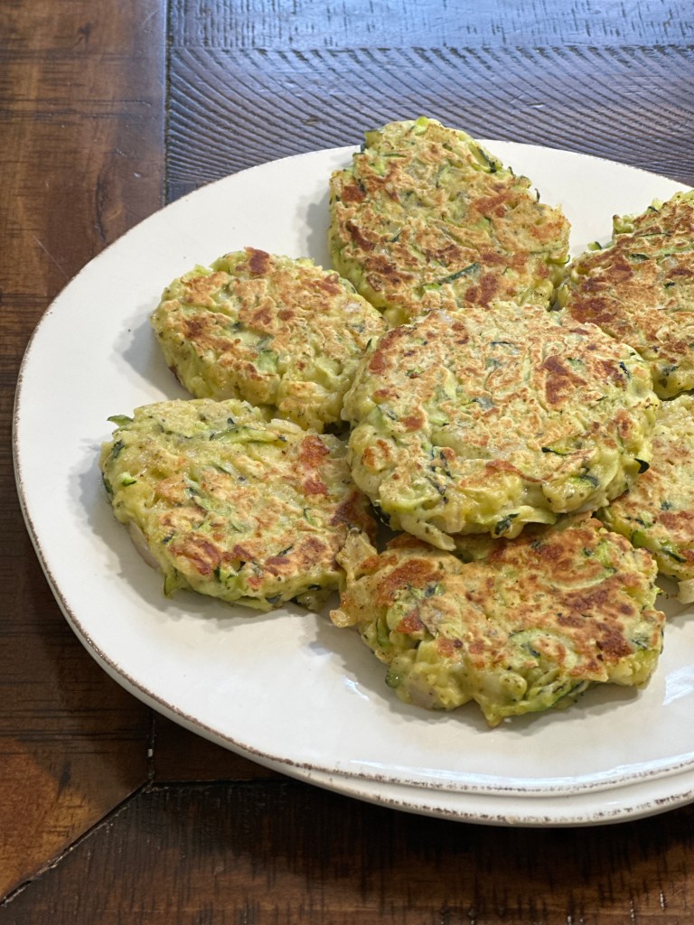 Lightly grease a heated griddle (I used a cast iron pan) and drop about 1/4 cup of the batter for each fritter. They recommended using a muffin/cookie scoop and that worked perfectly. Let them cook for about 3 minutes, or until the bottom is golden brown and you see bubbles forming on top. Flip them over and let them cook another 3-4 minutes.