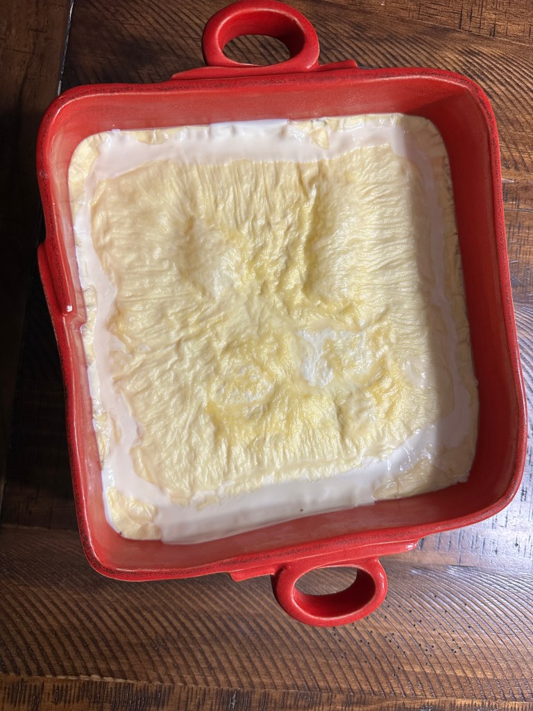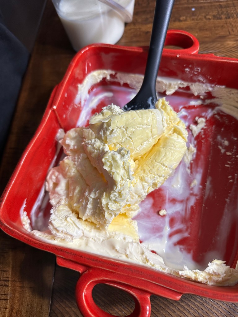 Before I talk about the scone recipe I’ll start with the clotted cream since we made it first. This is super easy as it’s basically just a quart of cream that’s baked on a low temperature all day. We opted not to use the rose water or sugar and used the kind recommended in the video from Sprouts since it’s not ultra-pasteurized. Pour this into a baking dish and bake on 175 for 12 hours. After it’s baked then you’ll want to let it come to room temperature before popping it into the fridge for another 12 hours. After it’s gone through this whole process you’ll gently pry away the top to reveal the skim milk at the bottom and drain it out. Then you’ll put the top part (the actual clotted cream) in a bowl. Save the milk as you can use this in the scones!