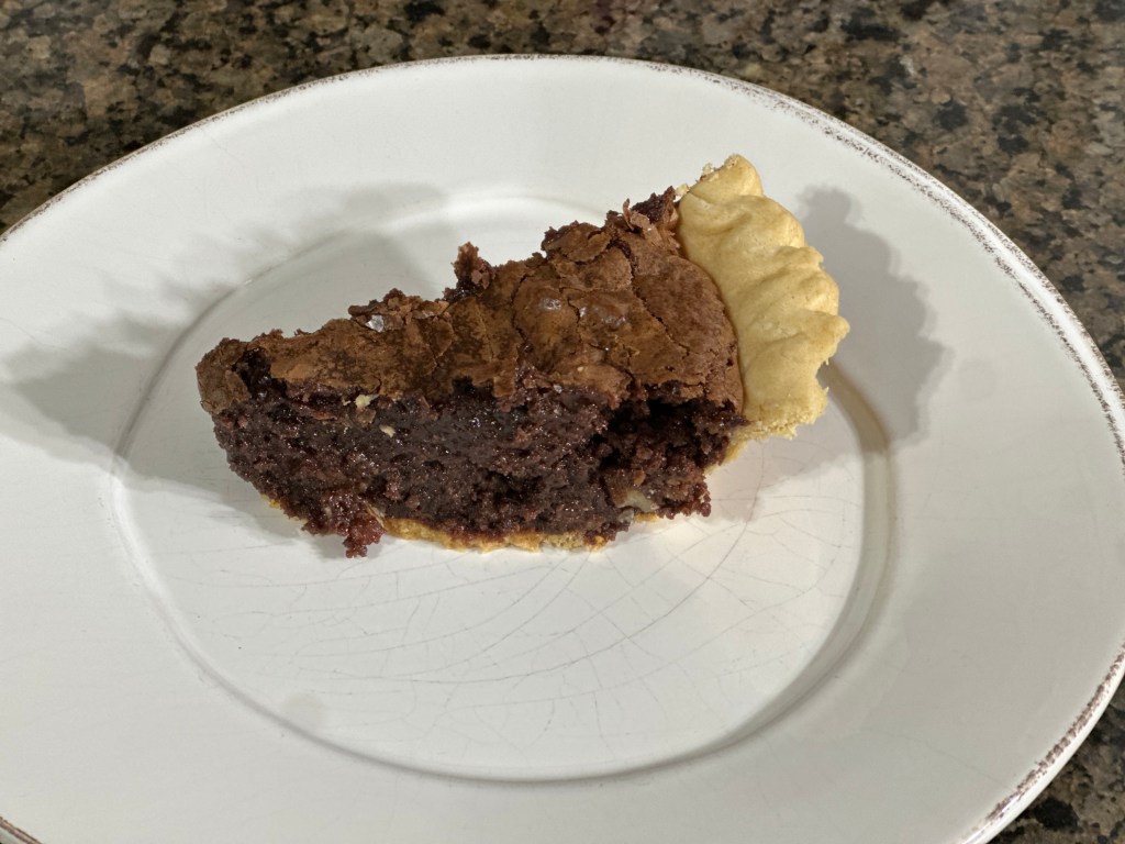 Once those have cooled then you can continue working on the filling. You’ll melt the butter and chocolate chips in the microwave; then whisk in the oil and cocoa. In a separate bowl you’ll want to mix together the sugar, eggs, vanilla extract, and salt. Add this to the chocolate mixture, then add the flour, the remaining chocolate chips, and toasted pecans. Put this into the pie crust and bake for about 35 minutes. You’ll want to let this cool for about an hour before digging in.