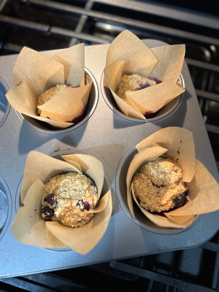 The process itself is very straightforward. You mix the wet ingredients in one bowl, fold in the dry ingredients and then gently fold in the bluberries. I used our big cookie scoop to portion these into muffin tins. There’s also a quick homemade jam topping you make by simmering some blueberries with a bit of honey and cinnamon but I’m realizing I completely missed that part somehow.